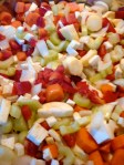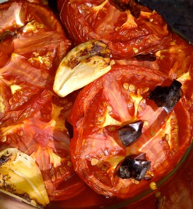 2. Cut Tomato in half (not through stem part but through the middle). Place in a small pan, cut side up. Sprinkle a little water on the bottom of the pan – not on the tomato! Place in oven with the squash for only 20 minutes. Remove and set aside (still in pan!).