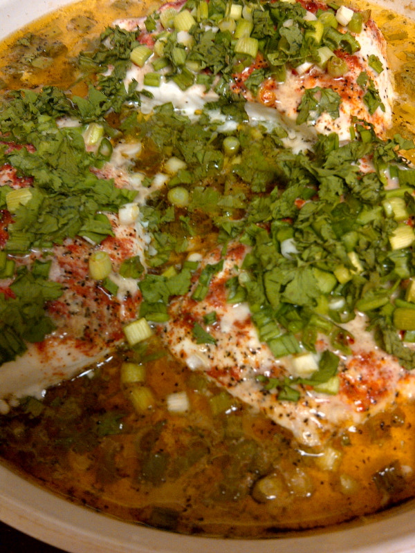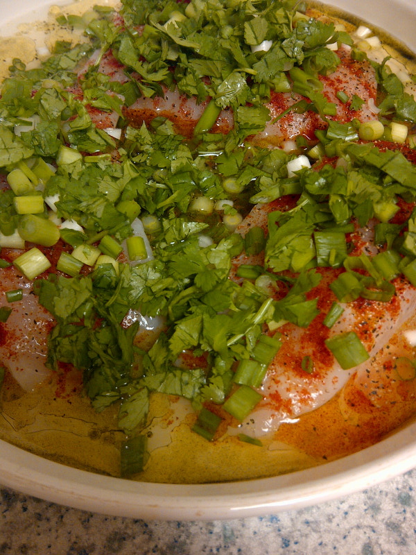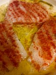 4. Wash Halibut, arrange in a pyrex or corningware dish that just fits it – not too big of a dish. Pour approx. 1/2 cup (or more) white wine over all. Drizzle about 1 Tbsp. olive oil, sprinkle liberally with paprika and add a light dusting of mustard powder. Chop up the parsley and green onions, sprinkle over each piece of fish. Place in oven with asparagus when the squash is almost done (10 minutes of cooking time left). Fish and asparagus will cook for approx. 20 minutes.